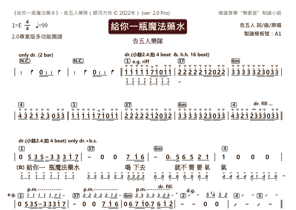 告五人乐队《给你一瓶魔法药水》乐队总谱 - 2.0版多功能团谱