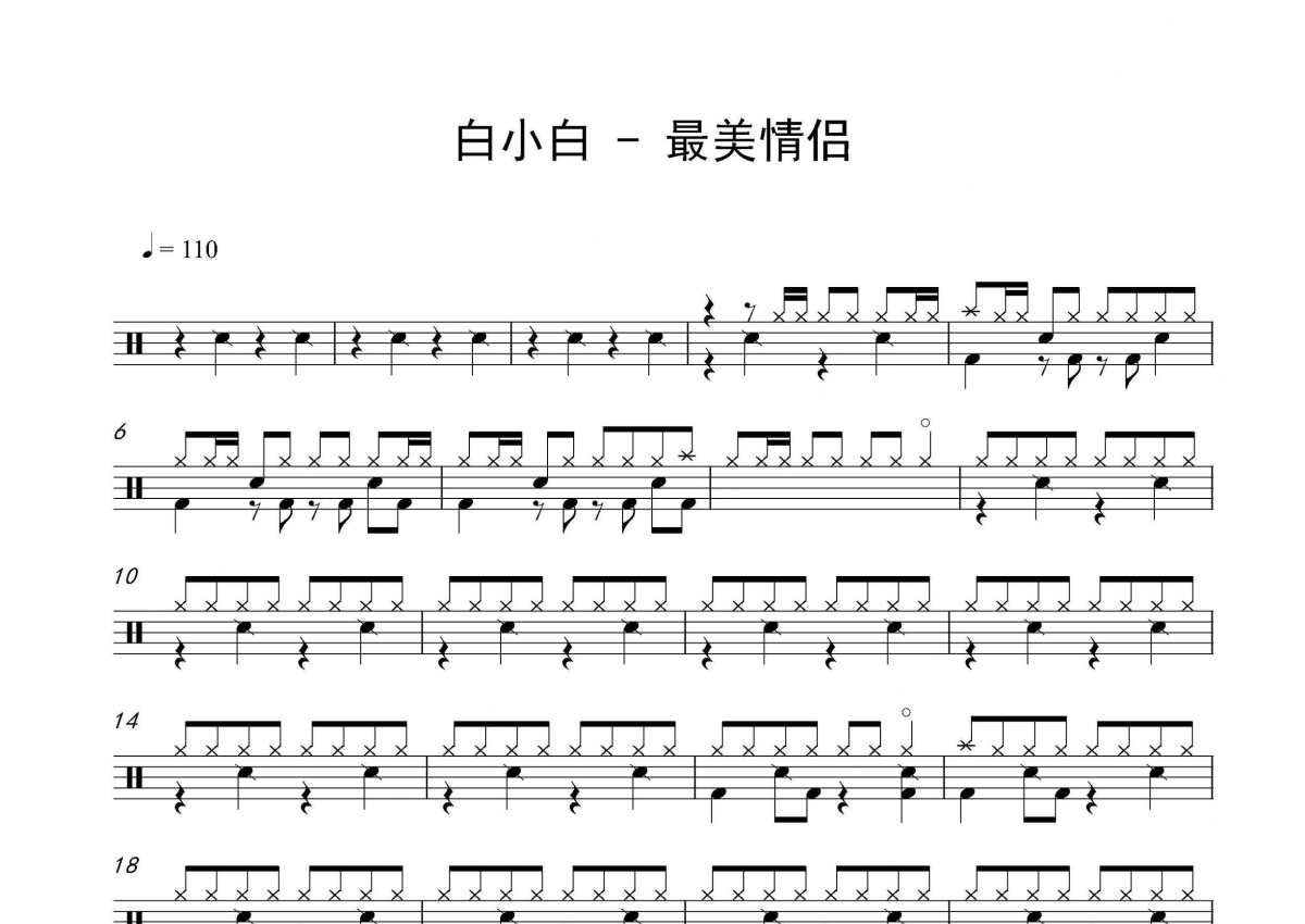 《最美情侣》是白小白演唱的一首歌曲,拍号为4/4拍,歌曲速度为每分钟110拍,这份架子鼓谱共有两张高清图谱,图谱由 @音符喷血者 编配上传,图谱使用五线谱编配,使用这份最美情侣架子鼓谱,你将能够轻松地敲打出这首白小白的最美情侣,快来尝试吧。