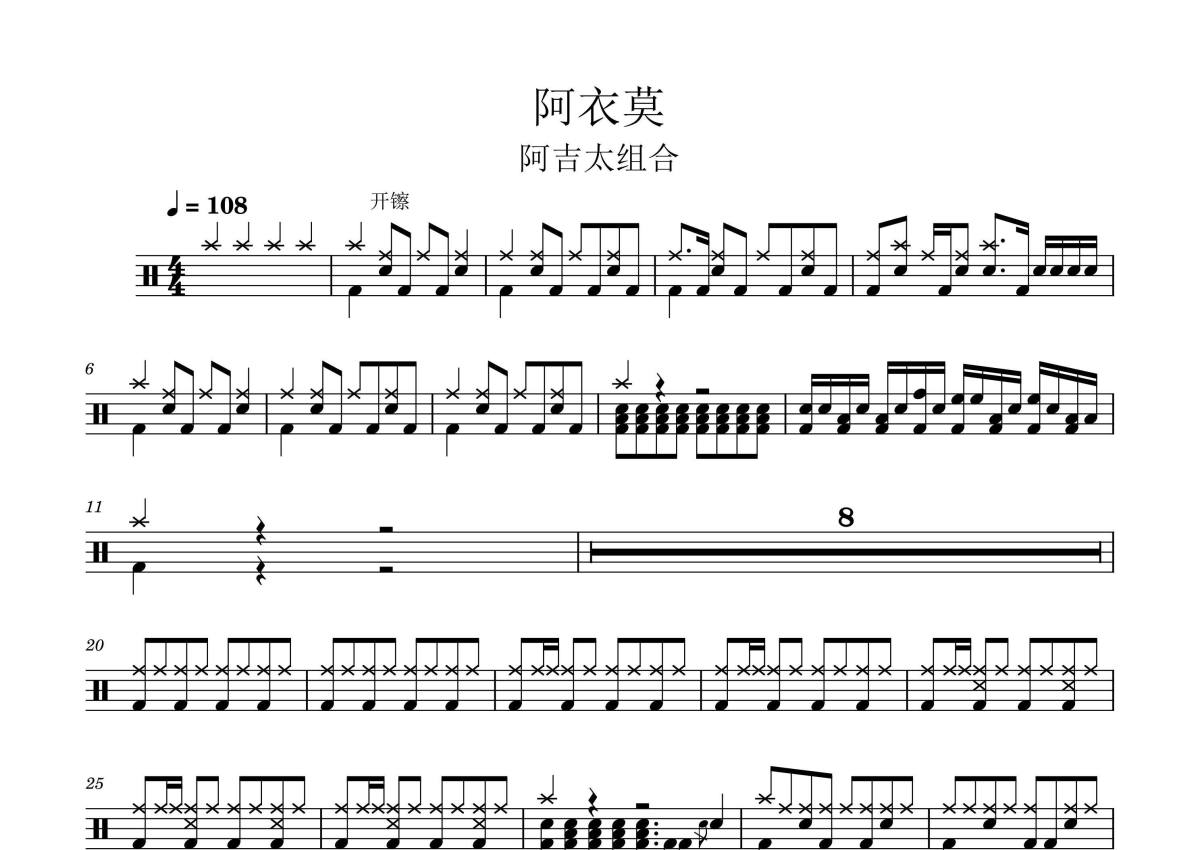 《阿衣莫》是阿吉太组合演唱的一首歌曲,拍号为4/4拍,歌曲速度为每分钟108拍,这份架子鼓谱共有三张高清图谱,图谱由 @音符喷血者 编配上传,图谱使用五线谱编配,使用这份阿衣莫架子鼓谱,你将能够轻松地敲打出这首阿吉太组合的阿衣莫,快来尝试吧。