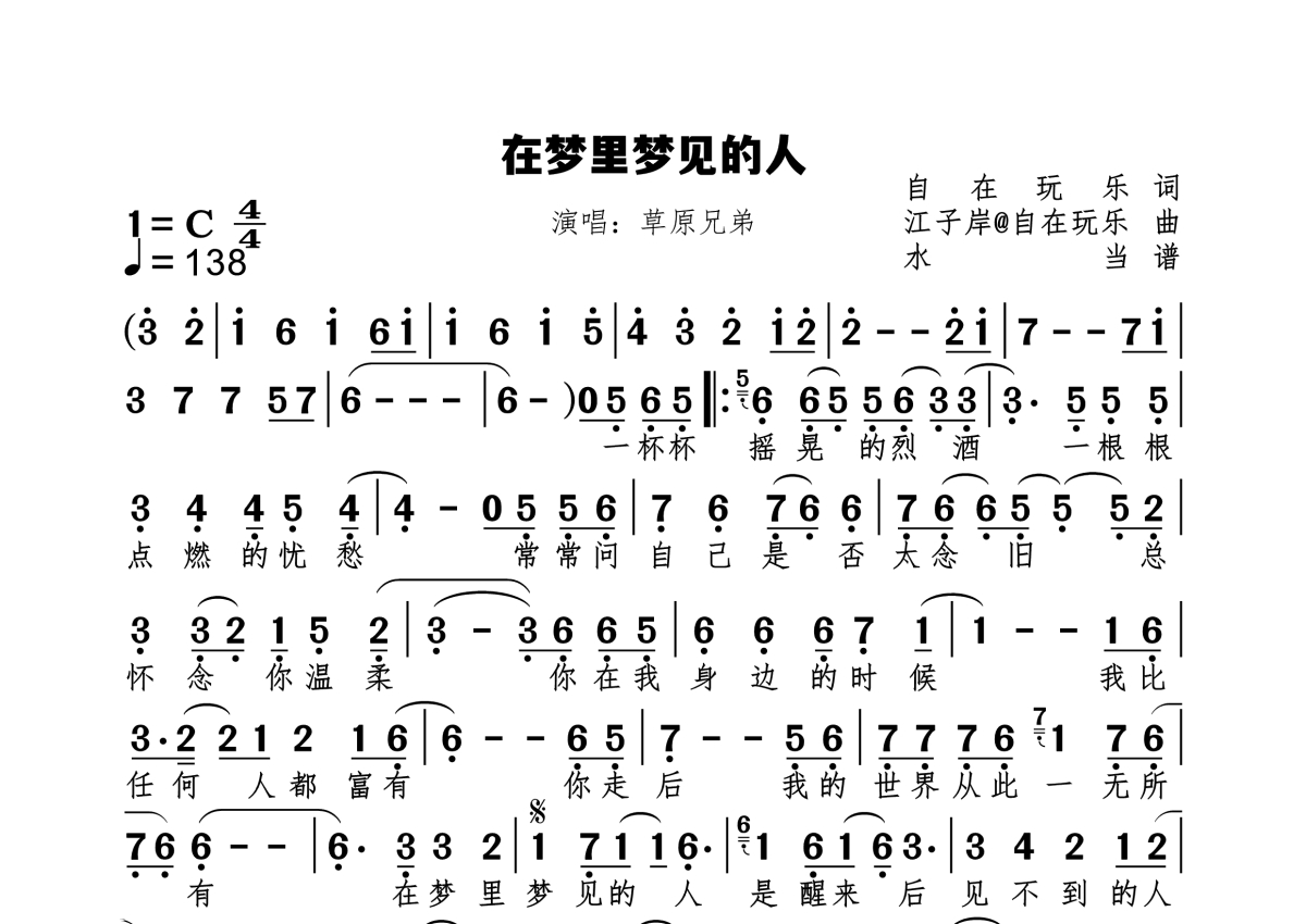 《在梦里梦见的人》是草原兄弟演唱的一首歌曲,拍号为4/4拍,歌曲速度为每分钟138拍,这份简谱共有一张高清图谱,图谱由 @水当 编配上传。