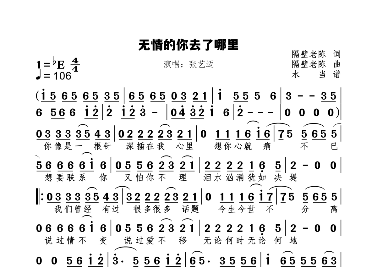 《无情的你去了哪里》是张艺迈演唱的一首歌曲,拍号为4/4拍,歌曲速度为每分钟106拍,这份简谱共有一张高清图谱,图谱由 @水当 编配上传。