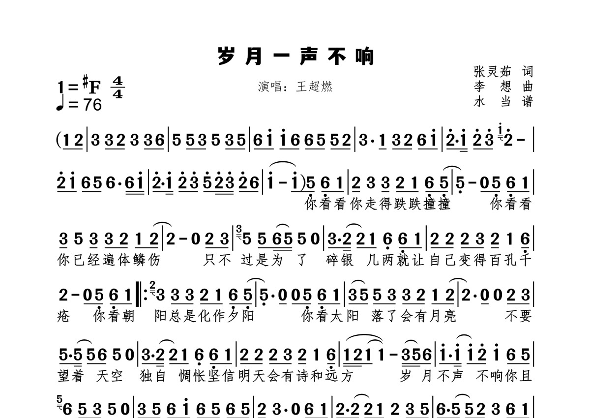 《岁月一声不响》是王超燃演唱的一首歌曲,拍号为4/4拍,歌曲速度为每分钟76拍,这份简谱共有一张高清图谱,图谱由 @水当 编配上传。
