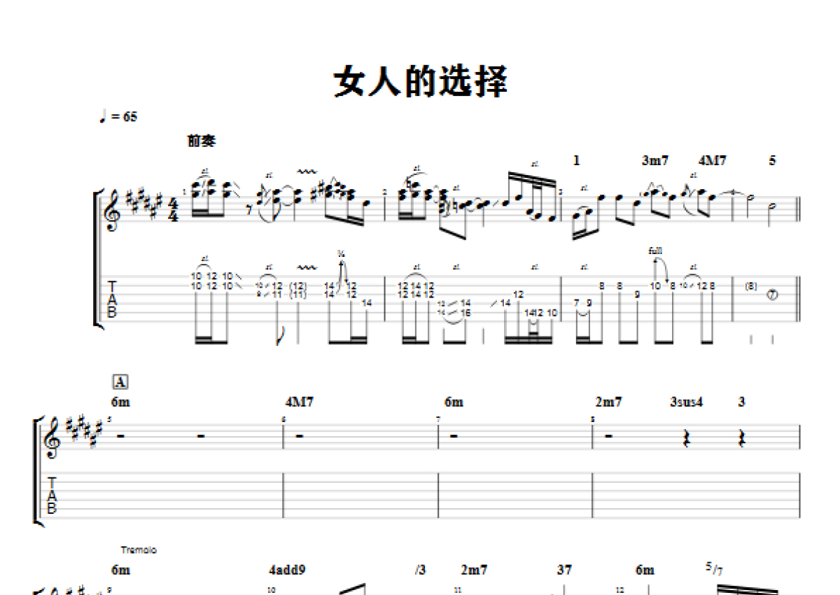 《女人的选择》是姜育恒演唱的一首歌曲,石头音乐原版记谱,拍号为4/4拍,歌曲速度为每分钟65拍,歌曲原调为Gb调,降半音调弦弹奏即为原调,当然也可以根据自己的音域决定是否调弦,这份电吉他谱共有五张高清图谱,图谱由 @石头音乐 编配上传,图谱使用六线谱编配,曲谱配备了相关的音频提供试听,使用这份女人的选择电吉他谱,可以让你更加方便地掌握这首歌曲的演奏技巧,快来尝试吧。原版电吉他前奏间奏分解加花全部都详尽写出了,适合仔细研究。