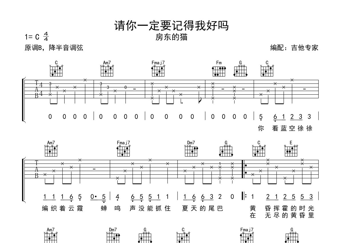 房东的猫《请你一定要记得我好吗》吉他谱 - C调弹唱六线谱
