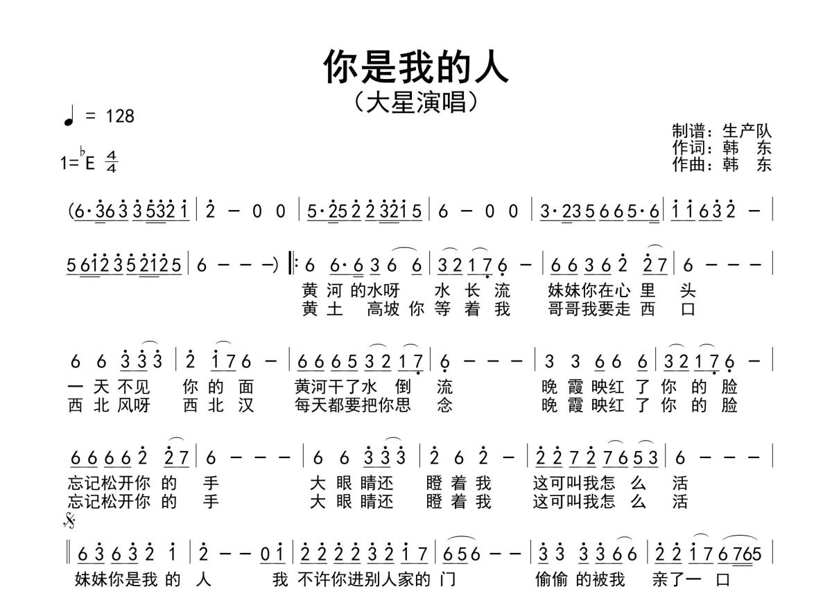 《你是我的人(DJ版)》是DJ版演唱的一首歌曲,原版简谱,拍号为4/4拍,歌曲速度为每分钟128拍,这份简谱共有一张高清图谱,图谱由 @生产队 编配上传大星演唱的歌曲《你是我的人》DJ版原版简谱,精准的前奏、间奏、尾奏solo编配,精编完美版,值得推荐!。