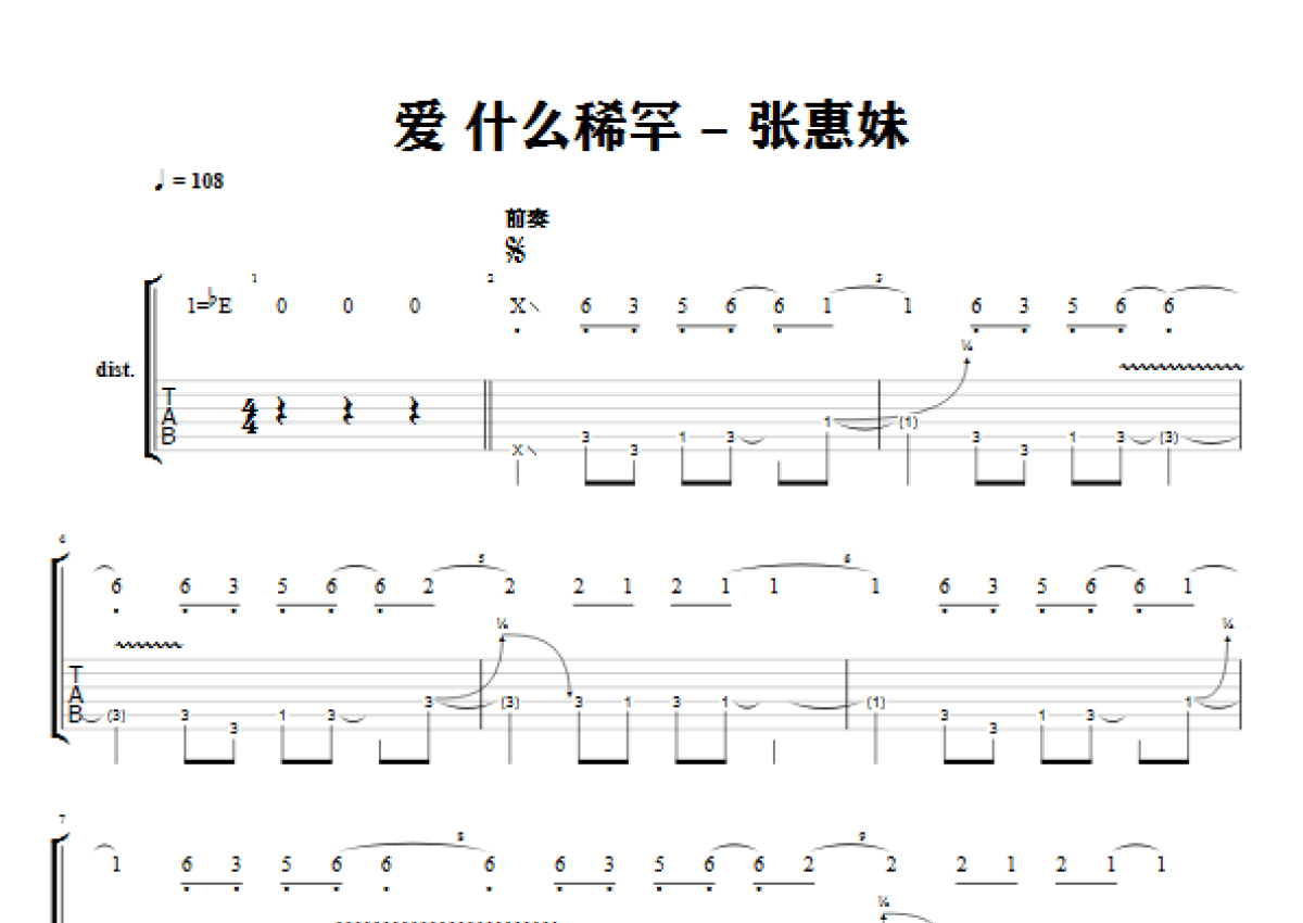 《爱什么稀罕》是张惠妹演唱的一首歌曲,石头音乐原版记谱,拍号为4/4拍,歌曲速度为每分钟108拍,歌曲原调为Eb调,这份电吉他谱共有六张高清图谱,图谱由 @石头音乐 编配上传,图谱使用六线谱编配,曲谱配备了相关的音频提供试听,使用这份爱什么稀罕电吉他谱,可以让你更加方便地掌握这首歌曲的演奏技巧,快来尝试吧。