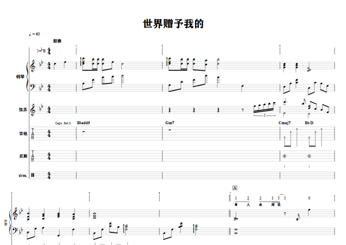 《世界赠予我的》是王菲演唱的一首歌曲,石头音乐原版记谱,歌曲速度为每分钟62拍,这份乐队总谱共有六张高清图谱,图谱由 @石头音乐 编配上传完整乐队总谱,人声旋律及歌词,钢琴,弦乐,吉他,贝斯,鼓详细每个音符。