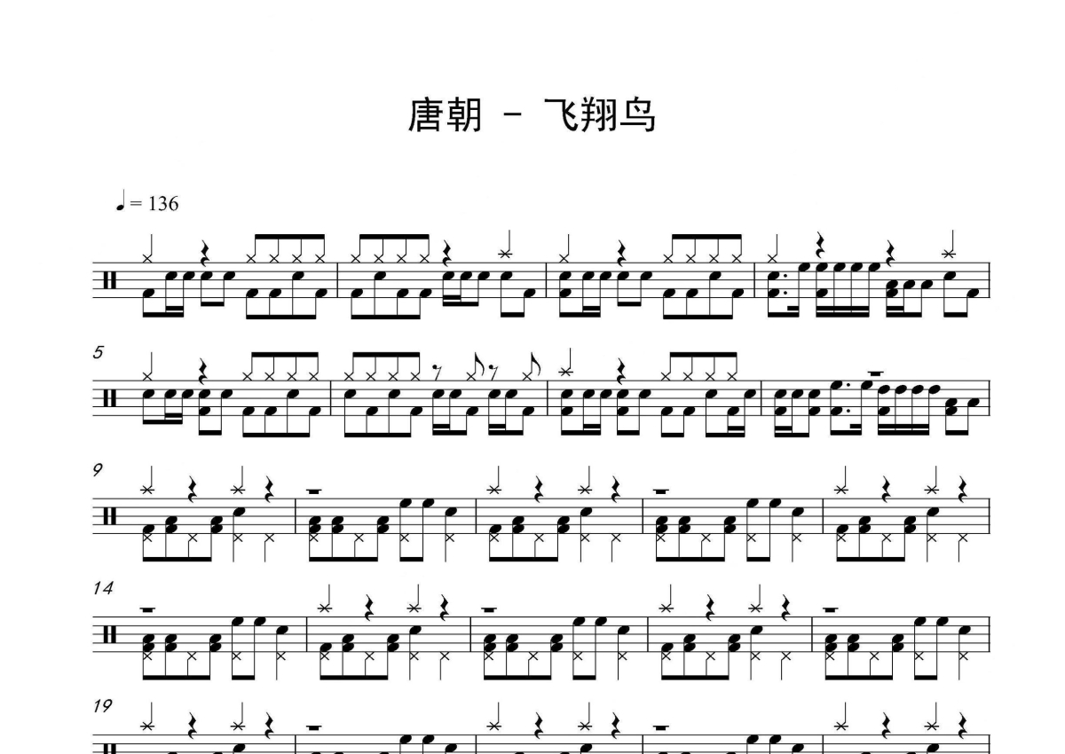 《飞翔鸟》是唐朝乐队演唱的一首歌曲,拍号为4/4拍,歌曲速度为每分钟136拍,这份架子鼓谱共有六张高清图谱,图谱由 @音符喷血者 编配上传,图谱使用五线谱编配,使用这份飞翔鸟架子鼓谱,你将能够轻松地敲打出这首唐朝乐队的飞翔鸟,快来尝试吧。