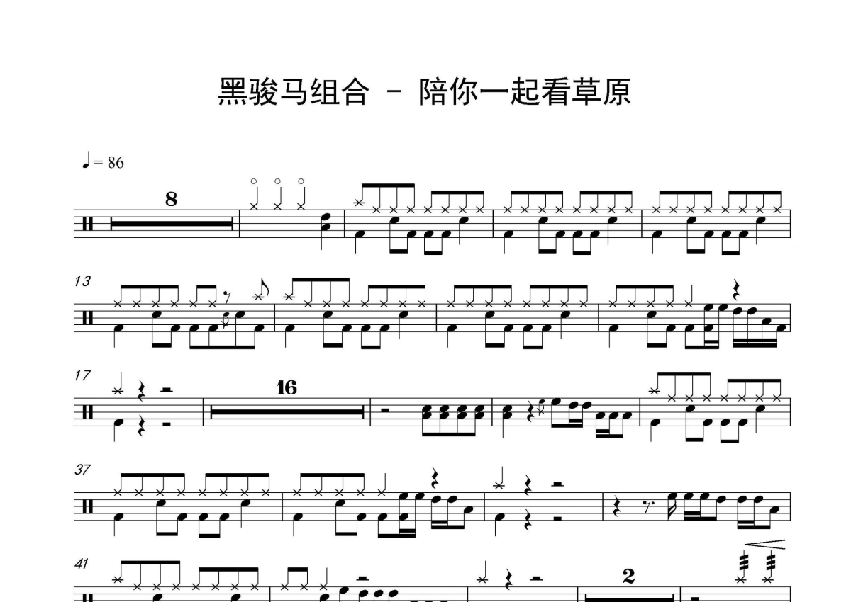 《陪你一起看草原》是黑骏马组合演唱的一首歌曲,拍号为4/4拍,歌曲速度为每分钟86拍,这份架子鼓谱共有两张高清图谱,图谱由 @音符喷血者 编配上传,图谱使用五线谱编配,使用这份陪你一起看草原架子鼓谱,你将能够轻松地敲打出这首黑骏马组合的陪你一起看草原,快来尝试吧。