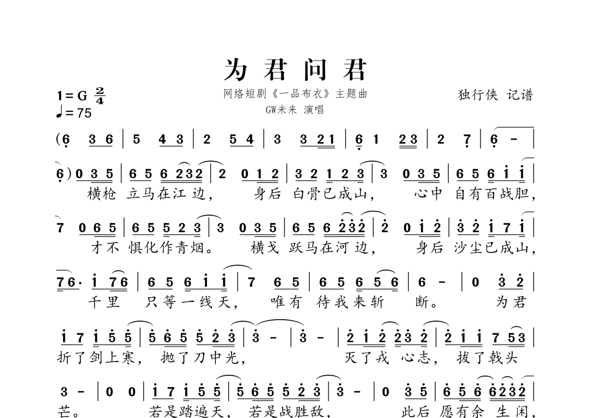 《为君问君》是GW未来《一品布衣》主题曲演唱的一首歌曲,这份简谱共有一张高清图谱,图谱由 @独行侠 编配上传。