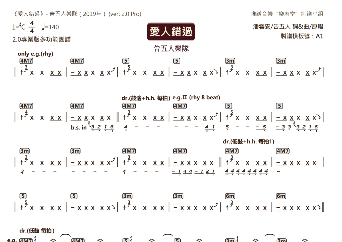“乐厨堂”乐谱发布小组: 出版级乐谱扒谱制谱——以职业乐手圈通行标准记谱,遵循原版和声、伴奏元素和段落结构。 ❶ 2.0多功能专业团谱:采用台湾卓著公司开创的二代简谱标准制作。二代简谱无疑是迄今为止最科学、最易读的专业范畴多功能记谱方案:❷ 框架谱:采用职业乐手通常记谱方案制作。