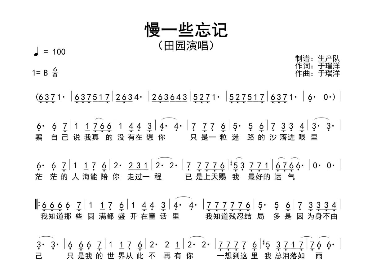 《慢一些忘记》是田园演唱的一首歌曲,原版简谱,拍号为6/8拍,歌曲速度为每分钟100拍,这份简谱共有一张高清图谱,图谱由 @生产队 编配上传田园演唱的歌曲《慢一些忘记》原版简谱,精准的前奏、间奏、尾奏solo编配,精编完美版,值得推荐!。