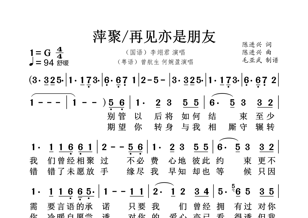 萍聚/再见亦是朋友简谱 - 李翊君 曾航生 何婉盈演唱