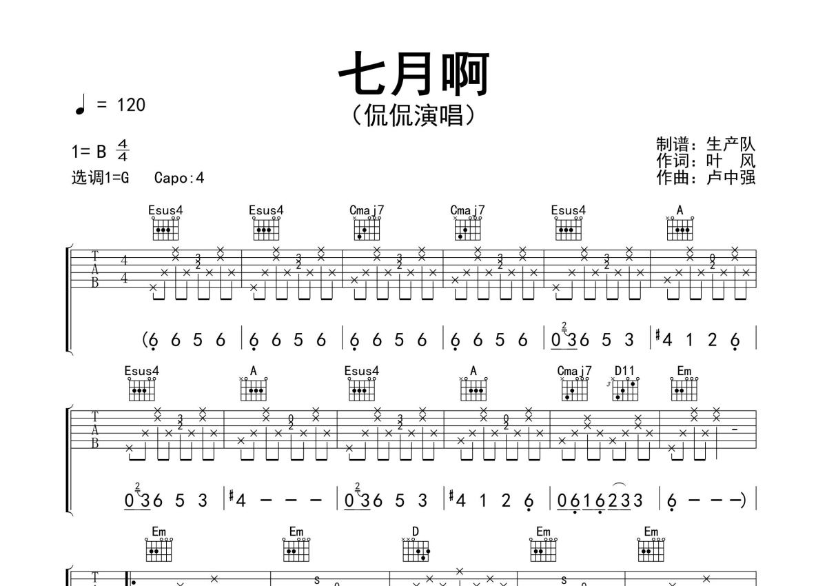 《七月啊》是侃侃演唱的一首歌曲,精编完美版,拍号为4/4拍,歌曲速度为每分钟120拍,歌曲原调为B调,但由于原调指法比较难,为了方便弹奏,本吉他谱采用的是G调指法编配,变调夹4品弹奏即为原调,当然也可以根据自己的音域改变变调夹位置,或者通过改变和弦调性,以方便自己弹奏,这份吉他谱共有三张高清图谱,图谱由 @生产队 编配上传,图谱使用六线谱编配,包含吉他和弦指法、简谱以及歌词部分,使用这份七月啊吉他谱,可以让你更加方便地掌握这首歌曲的弹唱技巧,快来尝试吧。侃侃演唱的歌曲《七月啊》原版吉他谱,含前奏、间奏solo编配,精编完美版,值得推荐!。