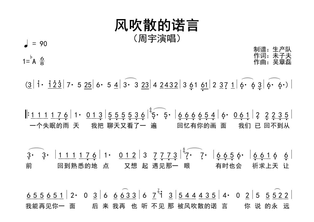 《风吹散的诺言》是周宇演唱的一首歌曲,原版简谱,拍号为6/8拍,歌曲速度为每分钟90拍,这份简谱共有一张高清图谱,图谱由 @生产队 编配上传周宇演唱的歌曲《风吹散的诺言》原版简谱,含前奏、间奏solo编配,精编完美版,值得推荐!。