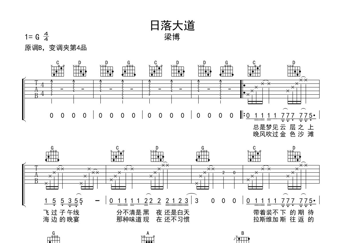 梁博《日落大道》吉他谱 - G调弹唱六线谱