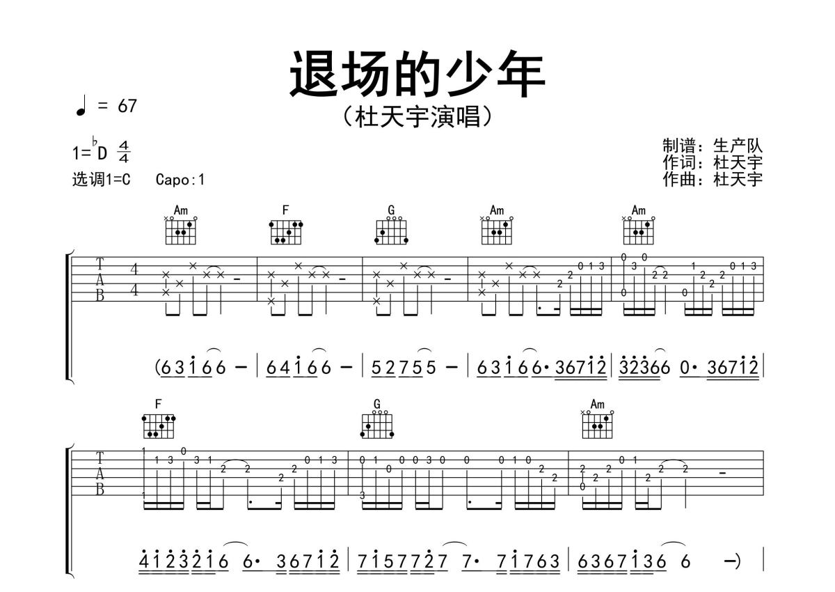 《退场的少年》是杜天宇演唱的一首歌曲,精编完美版,拍号为4/4拍,歌曲速度为每分钟67拍,歌曲原调为Db调,但由于原调指法比较难,为了方便弹奏,本吉他谱采用的是C调指法编配,变调夹1品弹奏即为原调,当然也可以根据自己的音域改变变调夹位置,或者通过改变和弦调性,以方便自己弹奏,这份吉他谱共有三张高清图谱,图谱由 @生产队 编配上传,图谱使用六线谱编配,包含吉他和弦指法、简谱以及歌词部分,使用这份退场的少年吉他谱,可以让你更加方便地掌握这首歌曲的弹唱技巧,快来尝试吧。杜天宇演唱的歌曲《退场的少年》原版吉他谱,含前奏、间奏solo编配,精编完美版,值得推荐!。