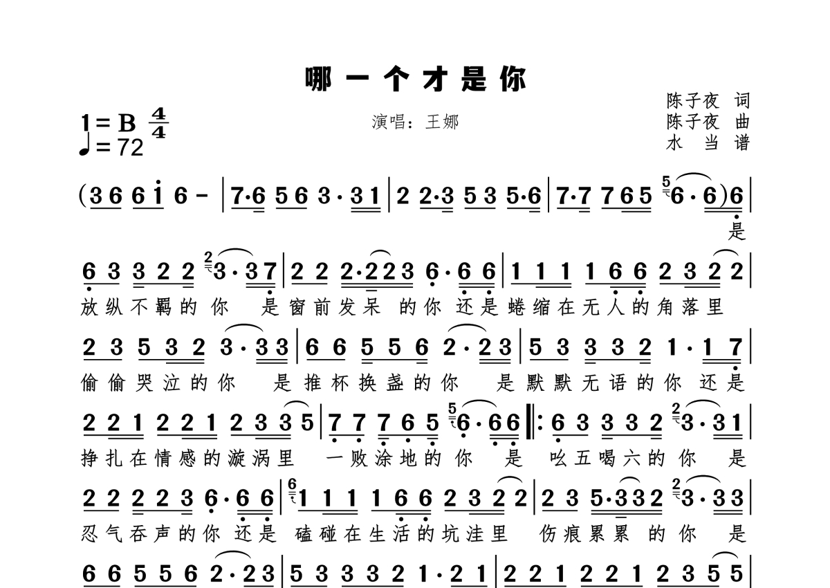 《哪一个才是你》是王娜演唱的一首歌曲,拍号为4/4拍,歌曲速度为每分钟72拍,这份简谱共有一张高清图谱,图谱由 @水当 编配上传。