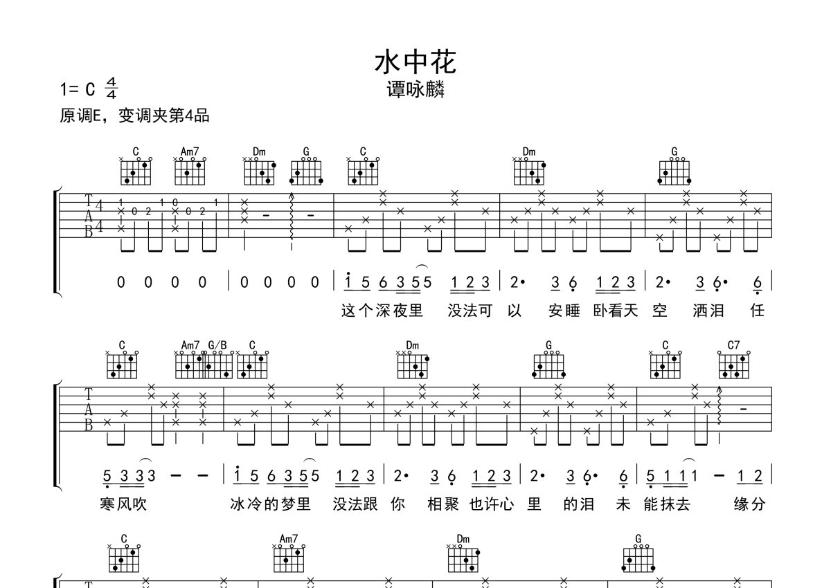 谭咏麟《水中花》吉他谱 - C调弹唱六线谱
