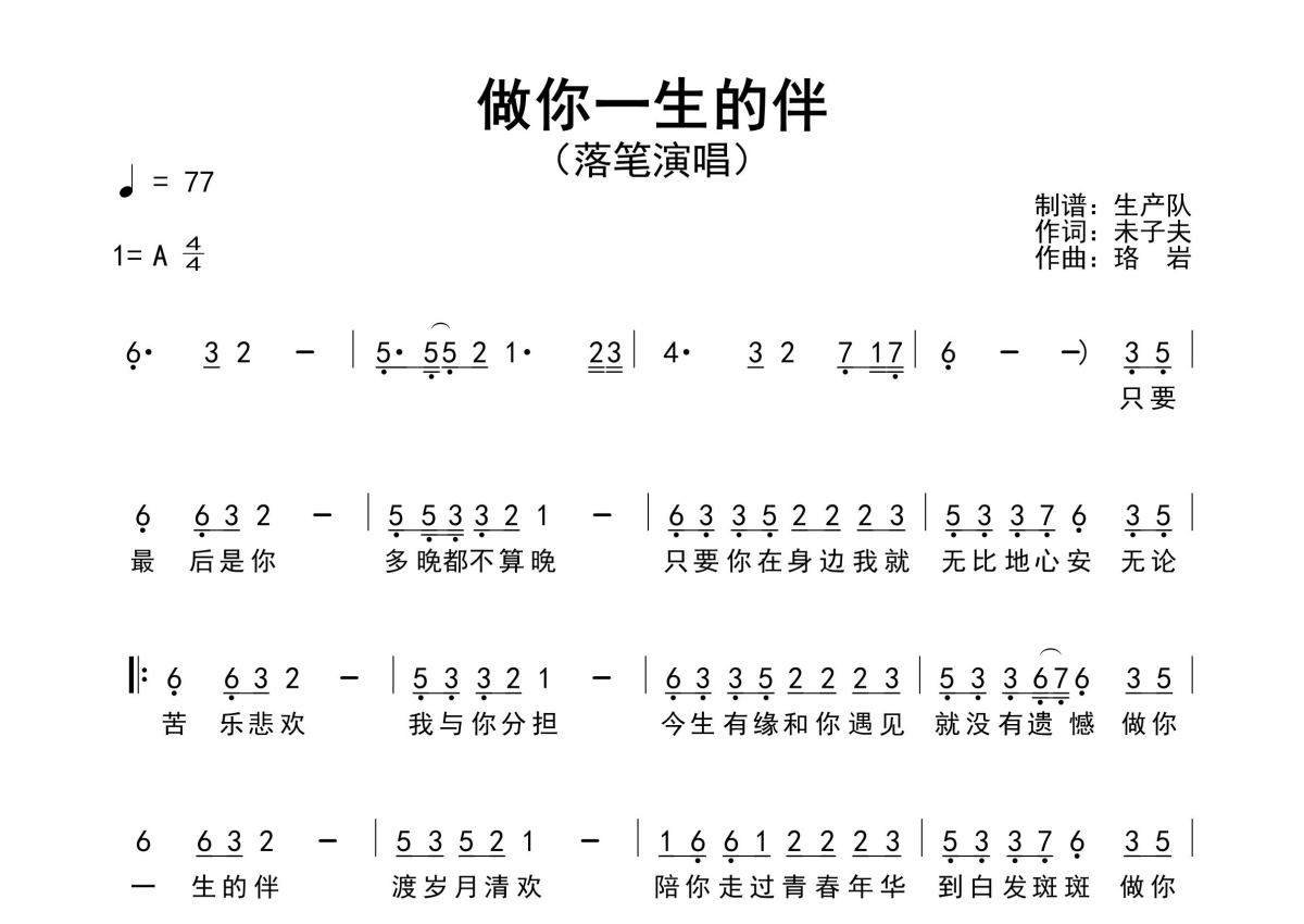《做你一生的伴》是落笔演唱的一首歌曲,原版简谱,拍号为4/4拍,歌曲速度为每分钟77拍,这份简谱共有一张高清图谱,图谱由 @生产队 编配上传落笔演唱的歌曲《做你一生的伴》原版简谱,含前奏、间奏solo编配,精编完美版,值得推荐。