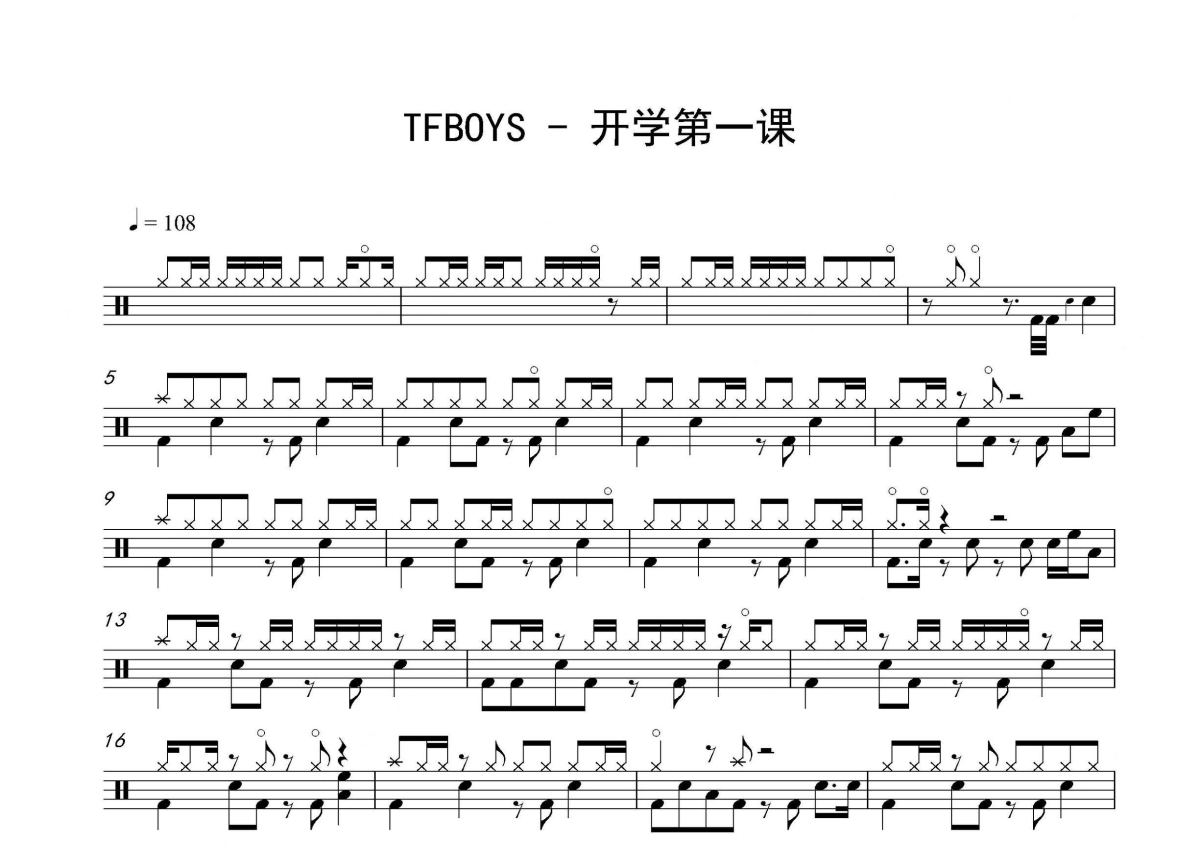 《开学第一课》是TFBOYS演唱的一首歌曲,拍号为4/4拍,歌曲速度为每分钟108拍,这份架子鼓谱共有两张高清图谱,图谱由 @音符喷血者 编配上传,图谱使用五线谱编配,使用这份开学第一课架子鼓谱,你将能够轻松地敲打出这首TFBOYS的开学第一课,快来尝试吧。