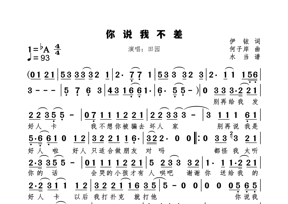 《你说我不差》是田园演唱的一首歌曲,拍号为4/4拍,歌曲速度为每分钟93拍,这份简谱共有一张高清图谱,图谱由 @水当 编配上传。