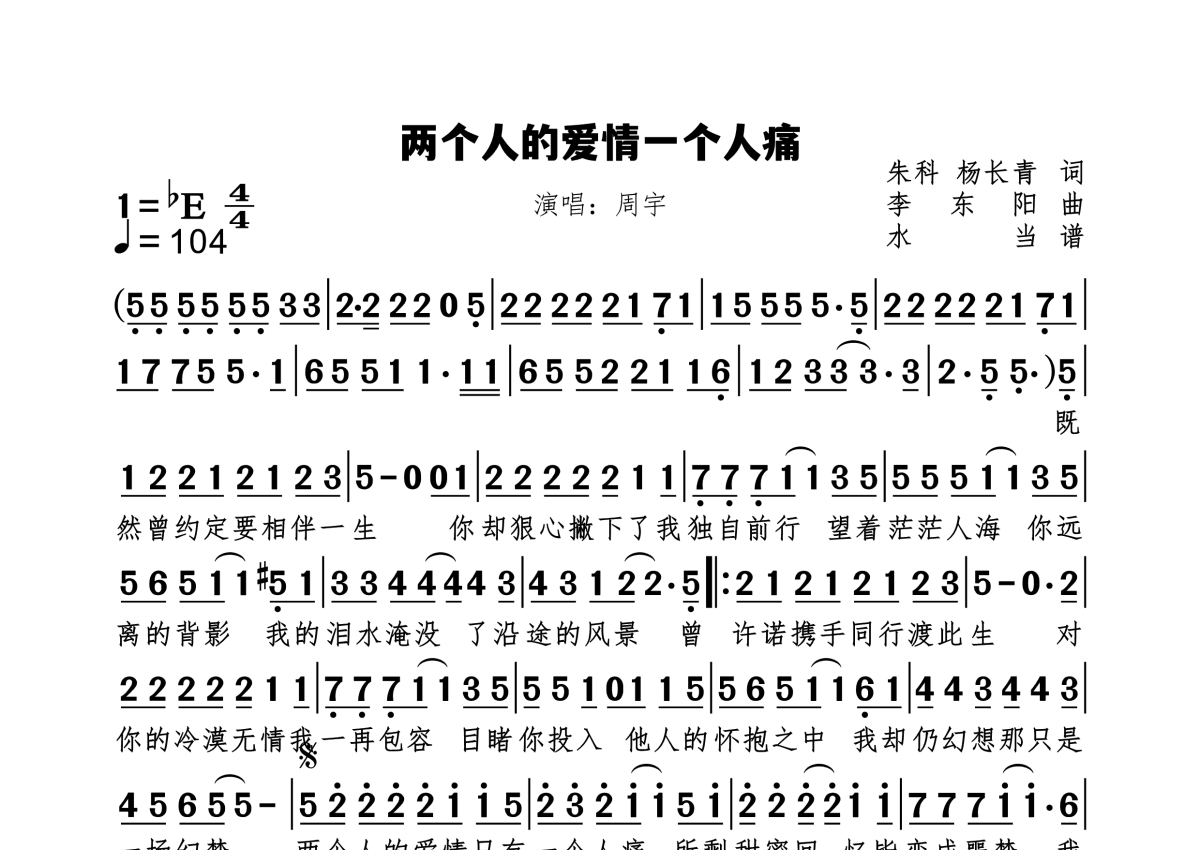 《两个人的爱情一个人痛》是周宇演唱的一首歌曲,拍号为4/4拍,歌曲速度为每分钟104拍,这份简谱共有一张高清图谱,图谱由 @水当 编配上传。