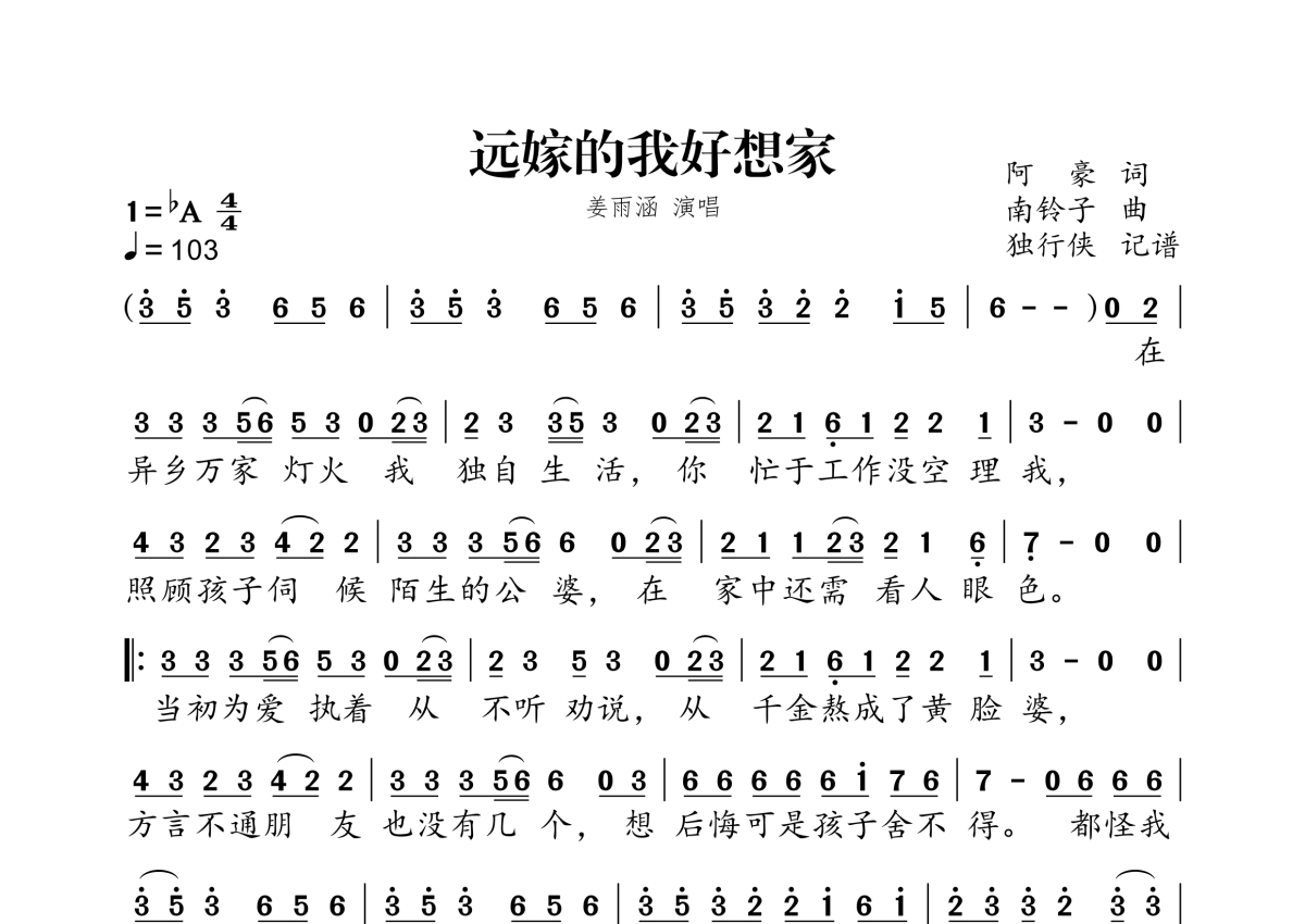 远嫁的我好想家简谱 - 姜雨涵演唱
