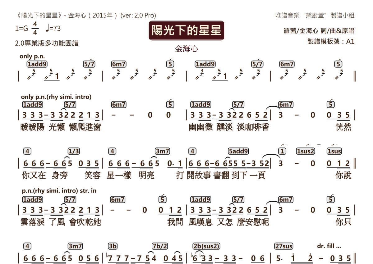 《阳光下的星星》是金海心演唱的一首歌曲,2.0版多功能团谱,这份乐队总谱共有两张高清图谱,图谱由 @唯谱音乐"乐厨堂"发布小组 编配上传。