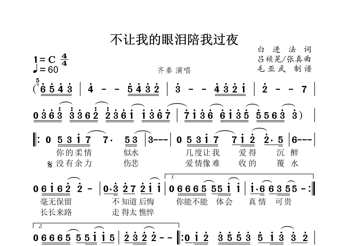 《不让我的眼泪陪我过夜》是齐秦演唱的一首歌曲,拍号为4/4拍,这份简谱共有一张高清图谱,图谱由 @秋天的童话 编配上传。
