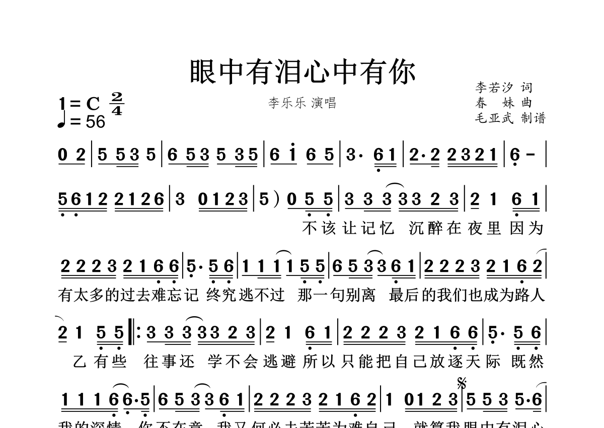 眼中有泪心中有你简谱 - 李乐乐演唱