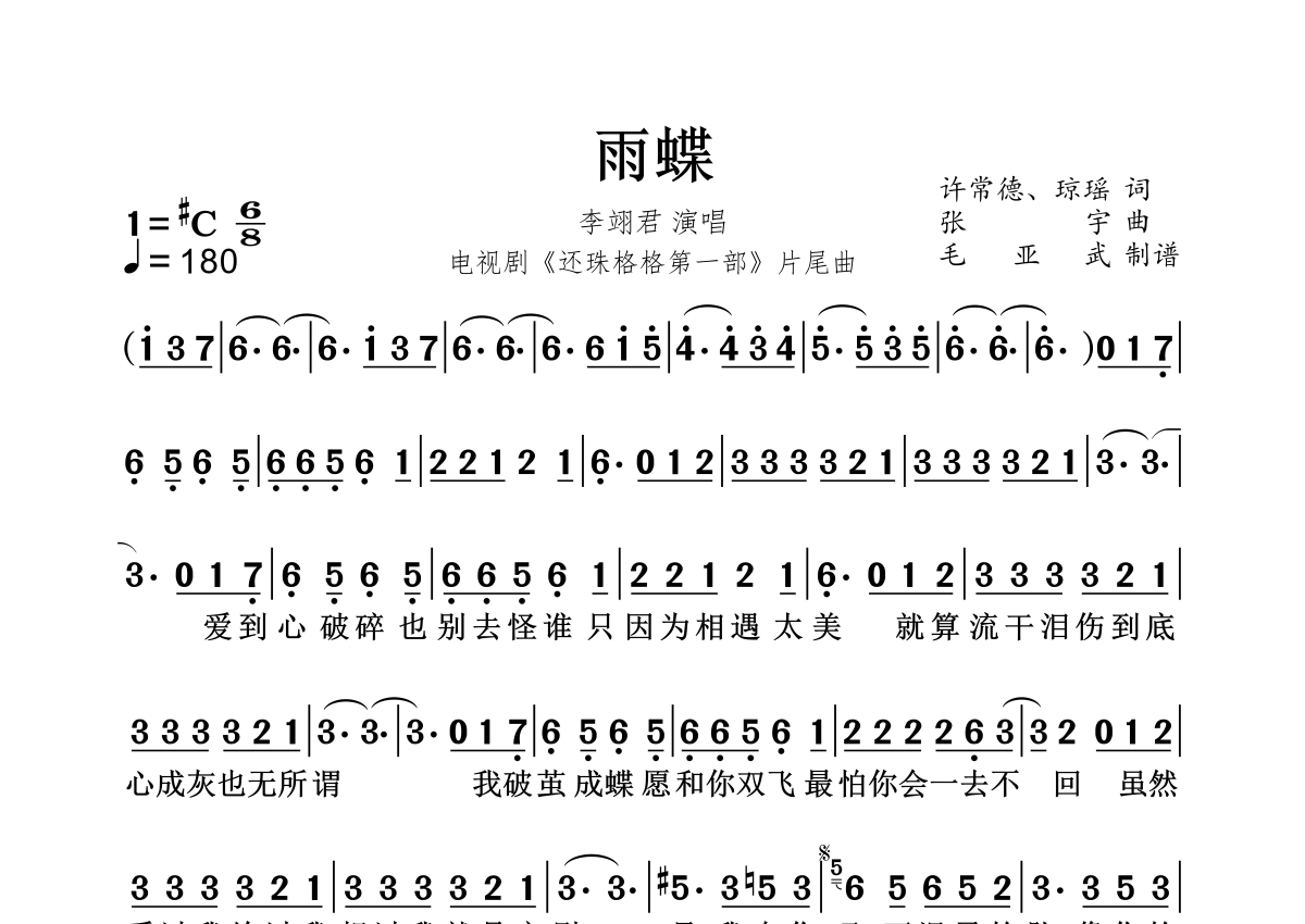 《雨蝶》是李翊君演唱的一首歌曲,拍号为6/8拍,这份简谱共有一张高清图谱,图谱由 @秋天的童话 编配上传。