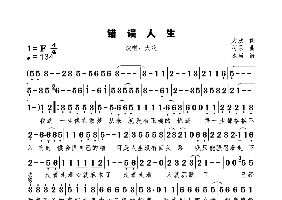 《错误人生》是大欢演唱的一首歌曲,拍号为4/4拍,歌曲速度为每分钟134拍,这份简谱共有一张高清图谱,图谱由 @水当 编配上传。