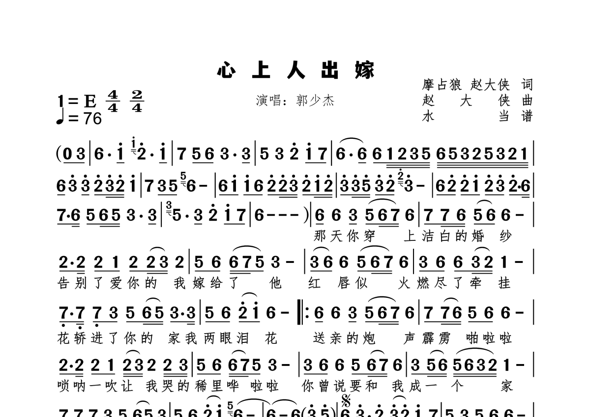 《心上人出嫁》是郭少杰演唱的一首歌曲,拍号为4/4拍,歌曲速度为每分钟76拍,这份简谱共有一张高清图谱,图谱由 @水当 编配上传。