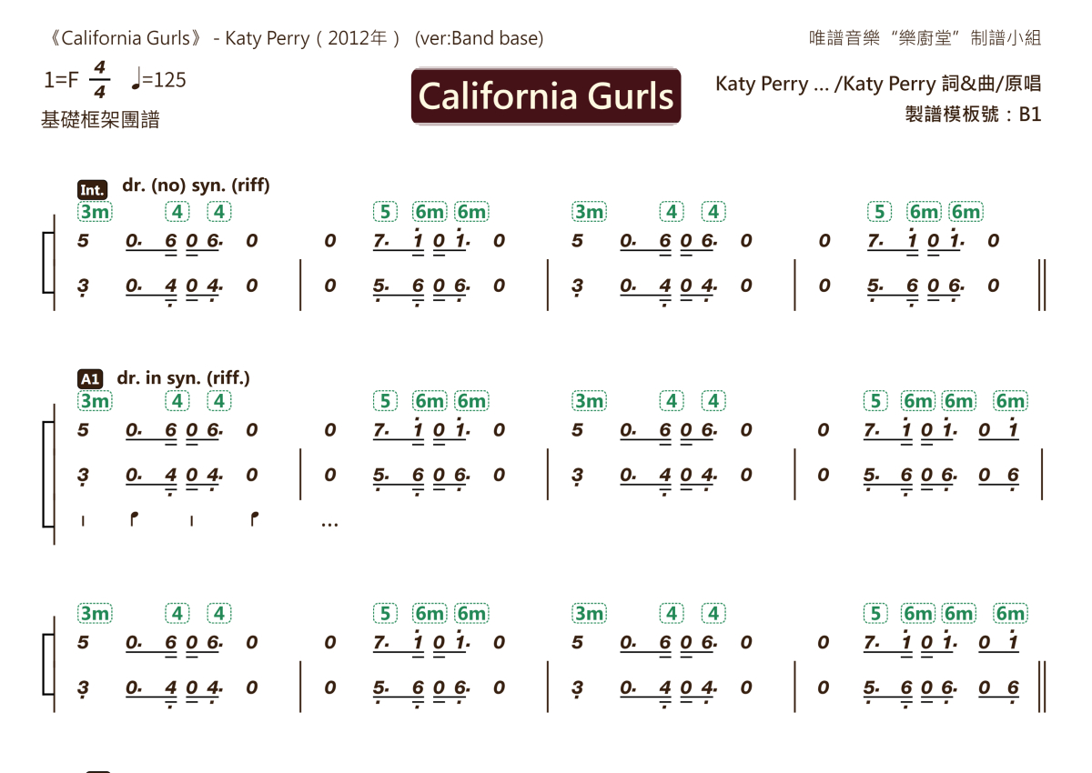 Katy Perry《California Gurls (加州女孩)》乐队总谱 - 基础版框架团谱