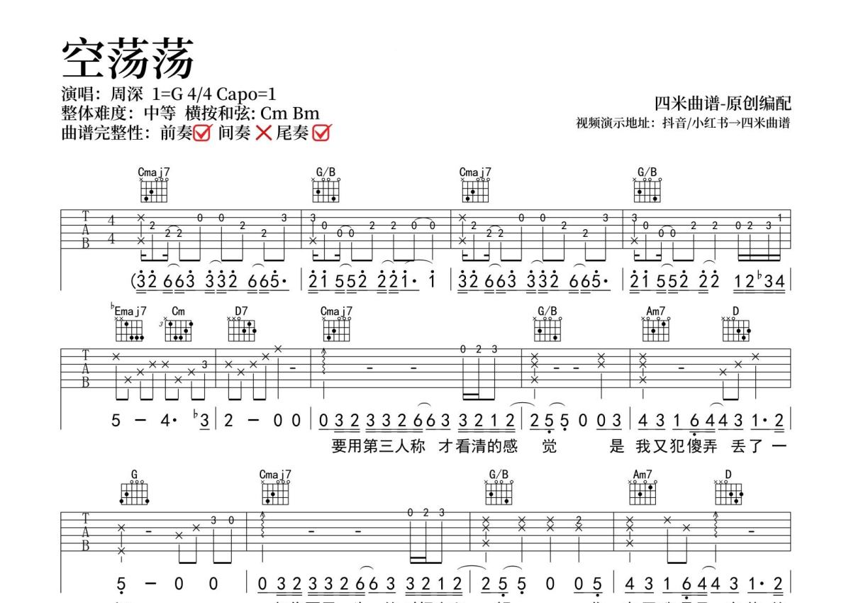 周深《空荡荡》吉他谱 - G调弹唱六线谱