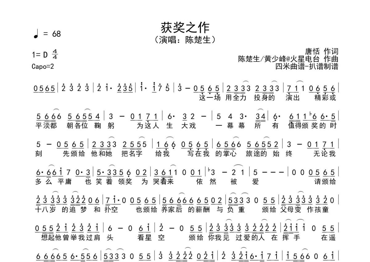 获奖之作简谱 - 陈楚生演唱