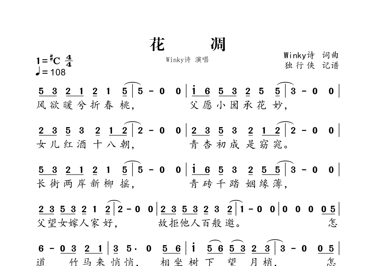 《花凋》是Winky诗演唱的一首歌曲,拍号为4/4拍,歌曲速度为每分钟108拍,这份简谱共有一张高清图谱,图谱由 @独行侠 编配上传。