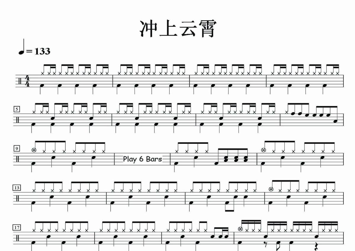 《冲上云霄》是Beyond演唱的一首歌曲,拍号为4/4拍,歌曲速度为每分钟133拍,这份架子鼓谱共有三张高清图谱,图谱由 @音符喷血者 编配上传,图谱使用五线谱编配,使用这份冲上云霄架子鼓谱,你将能够轻松地敲打出这首Beyond的冲上云霄,快来尝试吧。