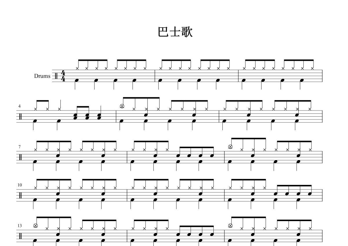 《巴士歌》是儿童歌曲演唱的一首歌曲,拍号为4/4拍,歌曲速度为每分钟82拍,这份架子鼓谱共有两张高清图谱,图谱由 @音符喷血者 编配上传,图谱使用五线谱编配,使用这份巴士歌架子鼓谱,你将能够轻松地敲打出这首儿童歌曲的巴士歌,快来尝试吧。