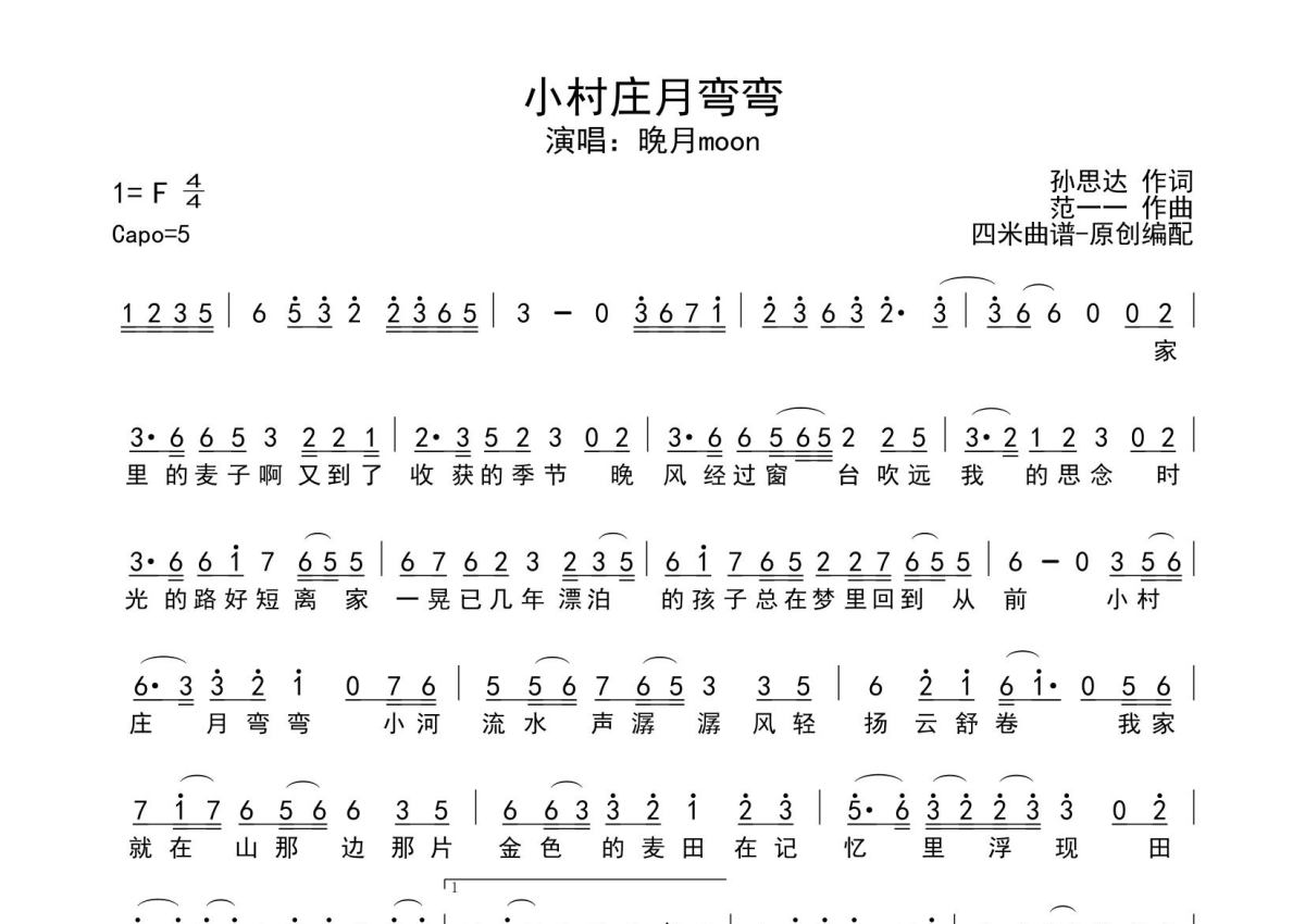 《小村庄月弯弯》是晚月moon演唱的一首歌曲,拍号为4/4拍,这份简谱共有一张高清图谱,图谱由 @SRV7758521 编配上传。