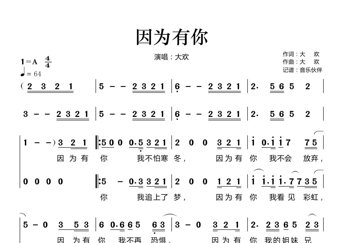 《因为有你》是大欢演唱的一首歌曲,拍号为4/4拍,歌曲速度为每分钟64拍,这份简谱共有两张高清图谱,图谱由 @音乐伙伴 编配上传。