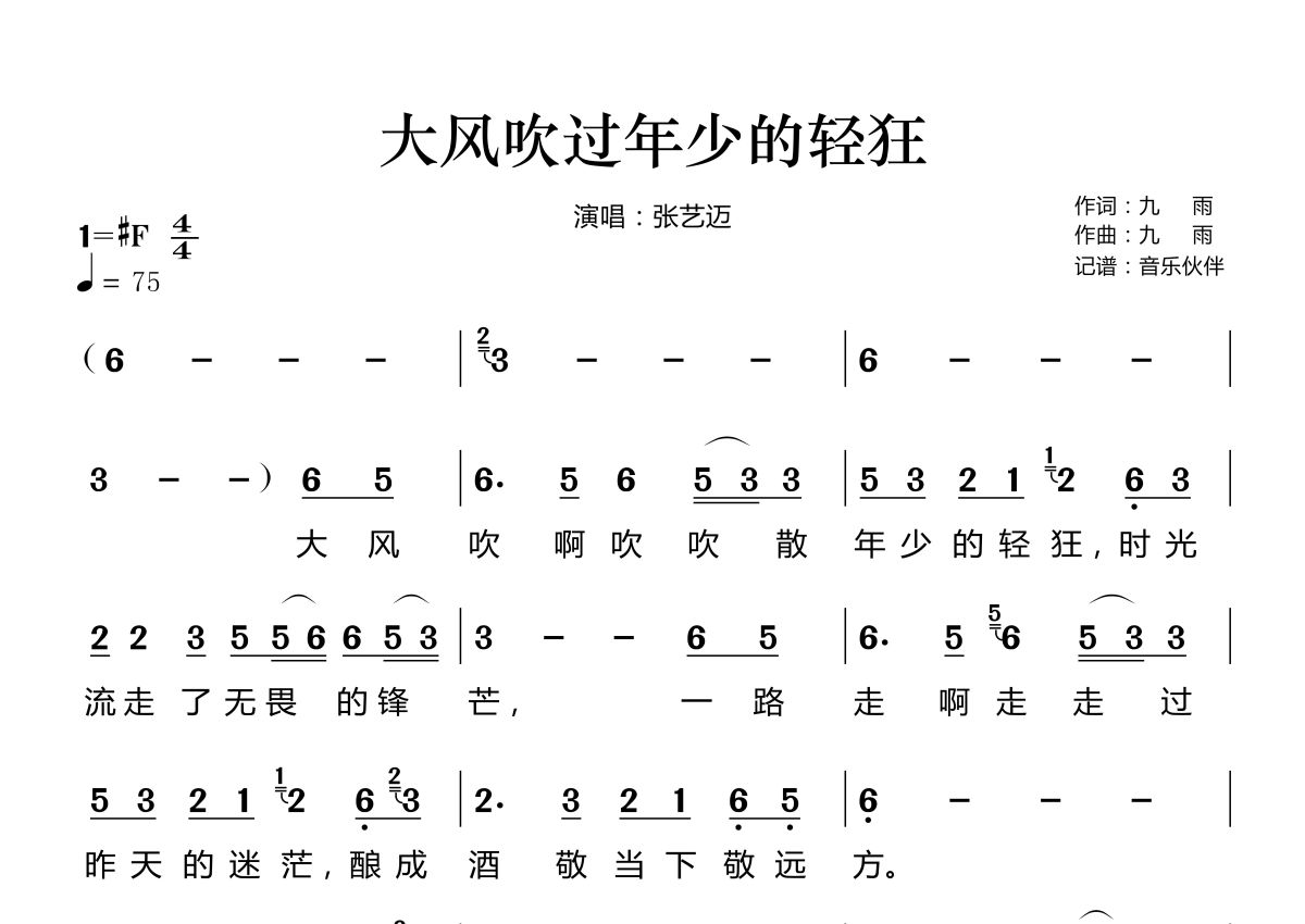 《大风吹过年少的轻狂》是张艺迈演唱的一首歌曲,拍号为4/4拍,歌曲速度为每分钟75拍,这份简谱共有两张高清图谱,图谱由 @音乐伙伴 编配上传。