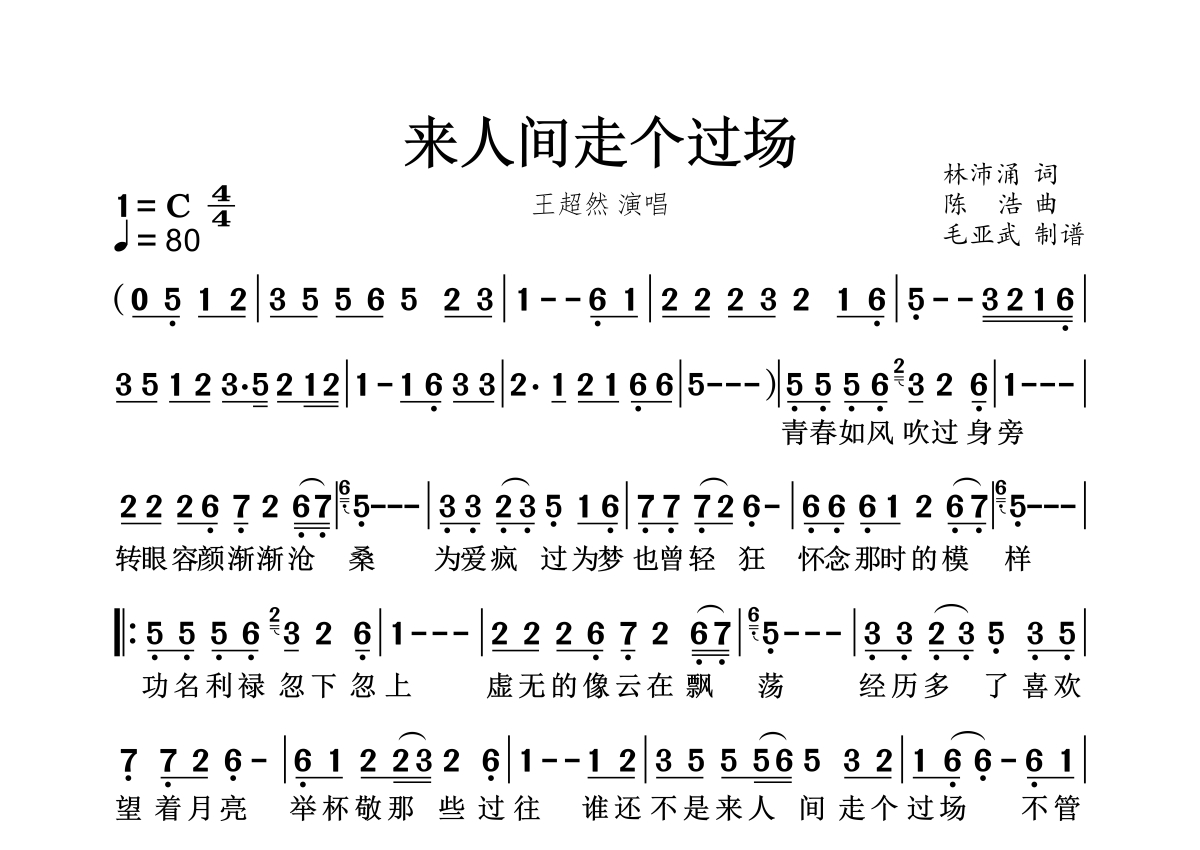 来人间走个过场简谱 - 王超然演唱