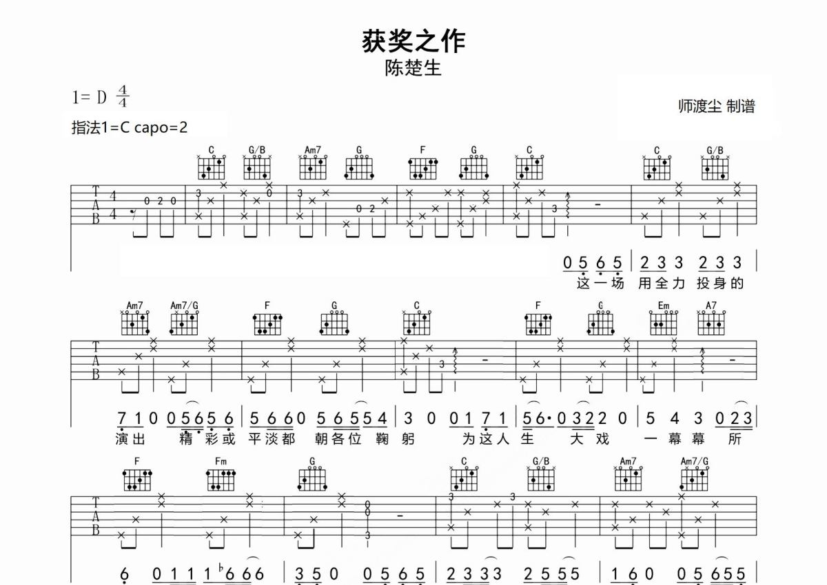 《获奖之作》是陈楚生演唱的一首歌曲,拍号为4/4拍,歌曲原调为D调,但由于原调指法比较难,为了方便弹奏,本吉他谱采用的是C调指法编配,变调夹2品弹奏即为原调,当然也可以根据自己的音域改变变调夹位置,或者通过改变和弦调性,以方便自己弹奏,这份吉他谱共有三张高清图谱,图谱由 @师渡尘 编配上传,图谱使用六线谱编配,包含吉他和弦指法、简谱以及歌词部分,使用这份获奖之作吉他谱,可以让你更加方便地掌握这首歌曲的弹唱技巧,快来尝试吧。