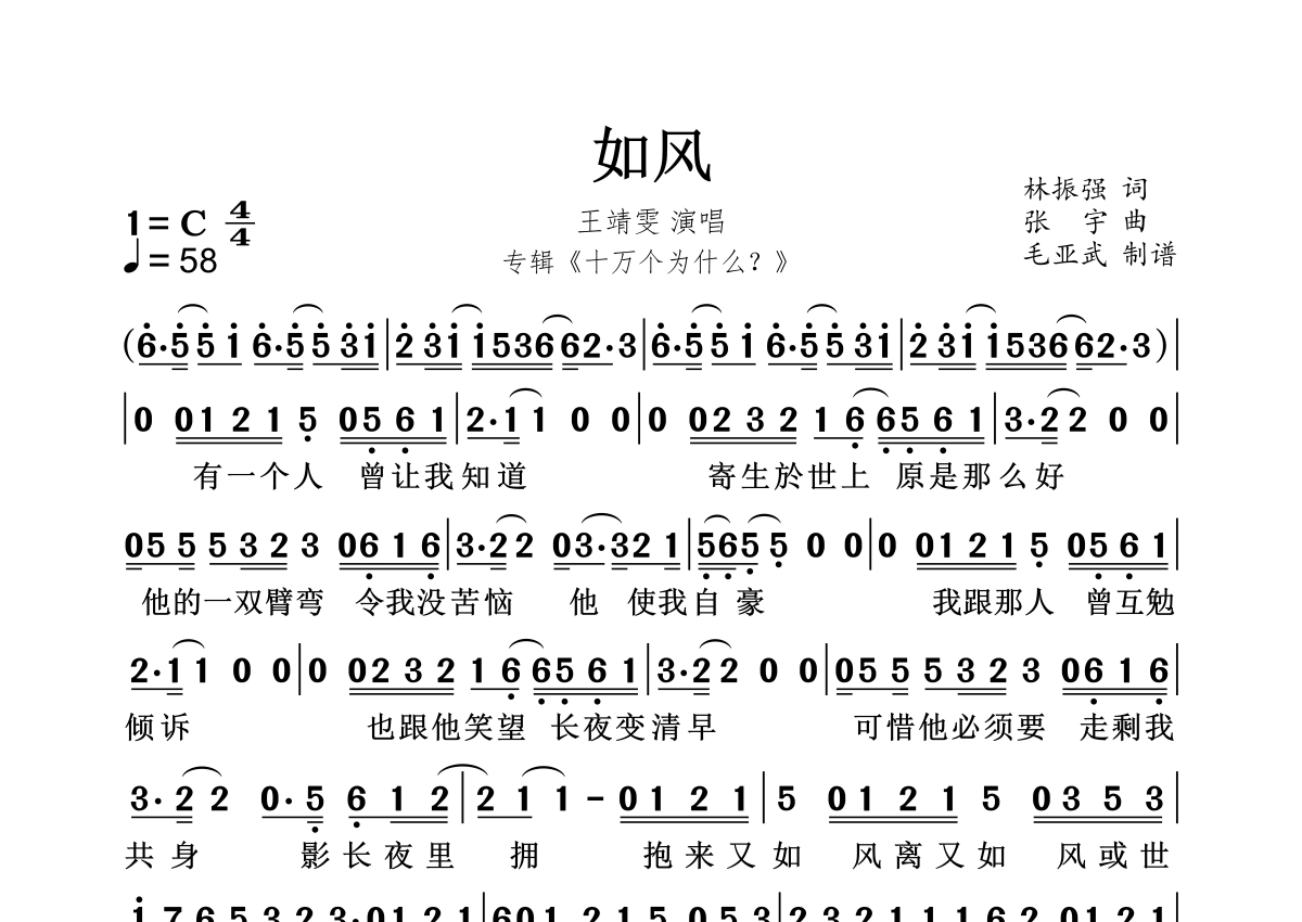 如风简谱 - 王菲演唱