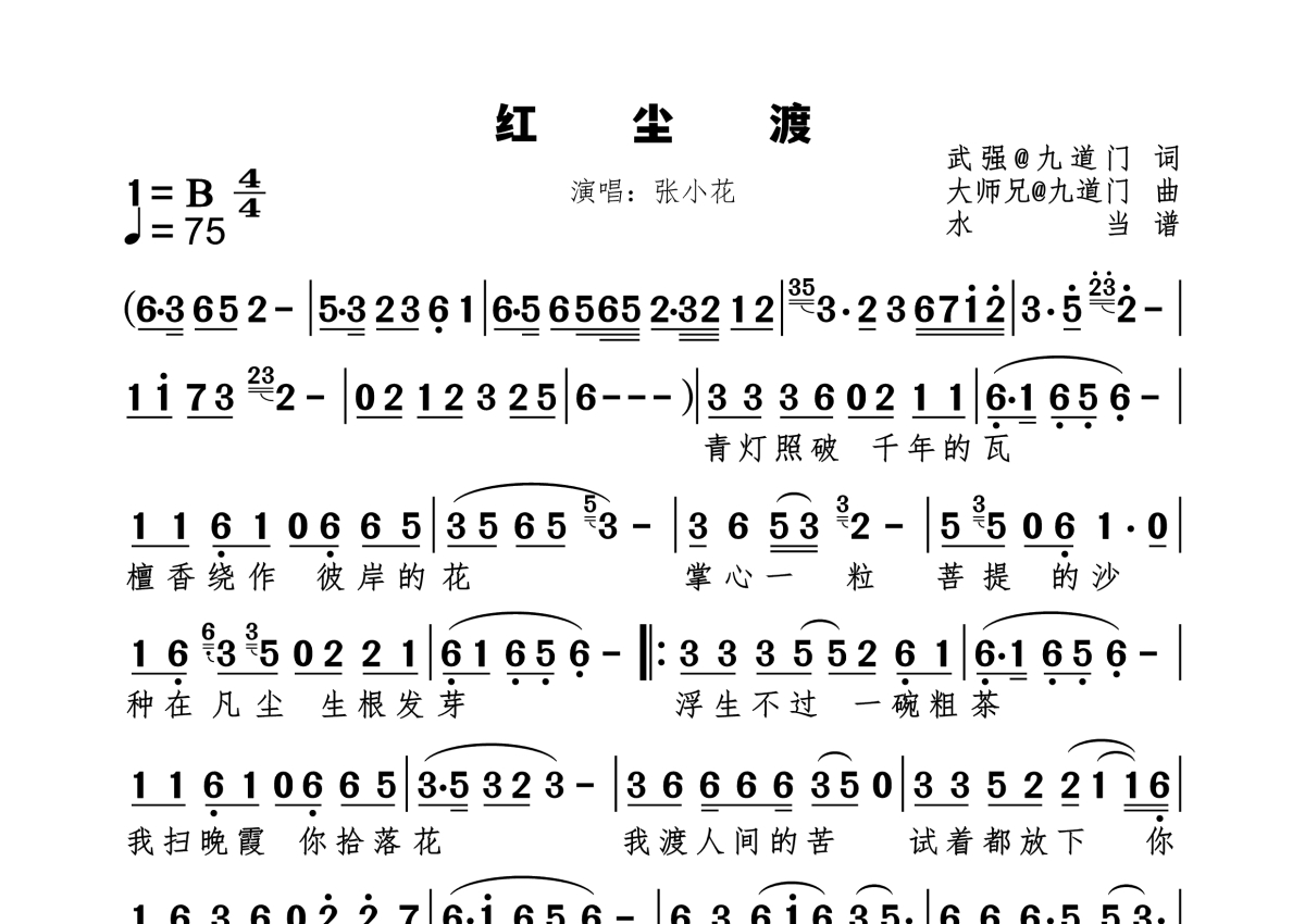 《红尘渡》是张小花演唱的一首歌曲,拍号为4/4拍,歌曲速度为每分钟75拍,这份简谱共有一张高清图谱,图谱由 @水当 编配上传。