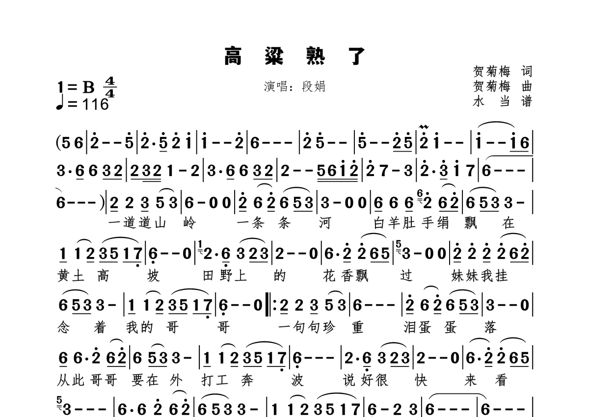 《高粱熟了》是段娟演唱的一首歌曲,拍号为4/4拍,歌曲速度为每分钟116拍,这份简谱共有一张高清图谱,图谱由 @水当 编配上传。