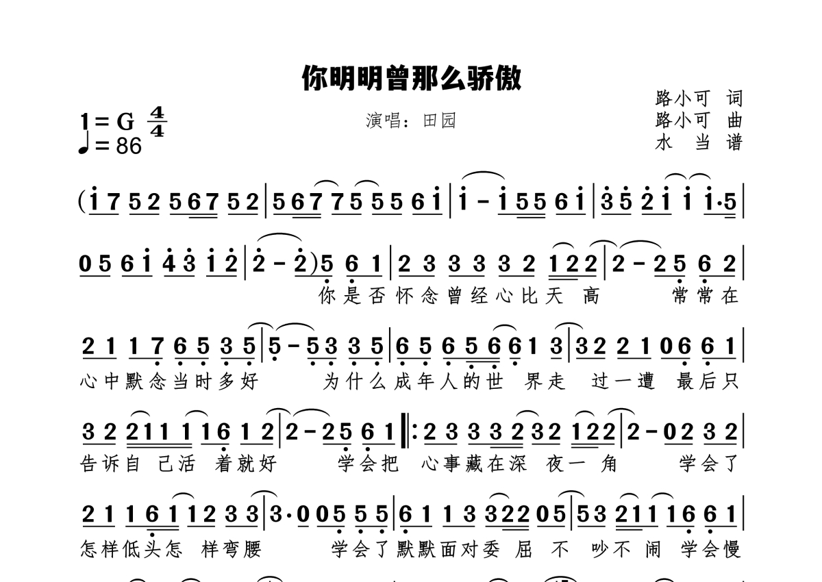《你明明曾那么骄傲》是田园演唱的一首歌曲,拍号为4/4拍,歌曲速度为每分钟86拍,这份简谱共有一张高清图谱,图谱由 @水当 编配上传。
