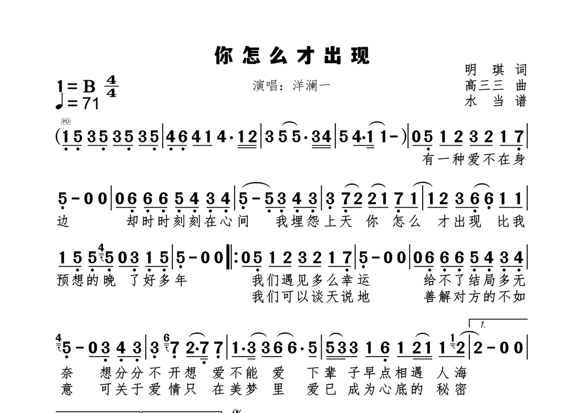 《你怎么才出现》是洋澜一演唱的一首歌曲,拍号为4/4拍,歌曲速度为每分钟71拍,这份简谱共有一张高清图谱,图谱由 @水当 编配上传。